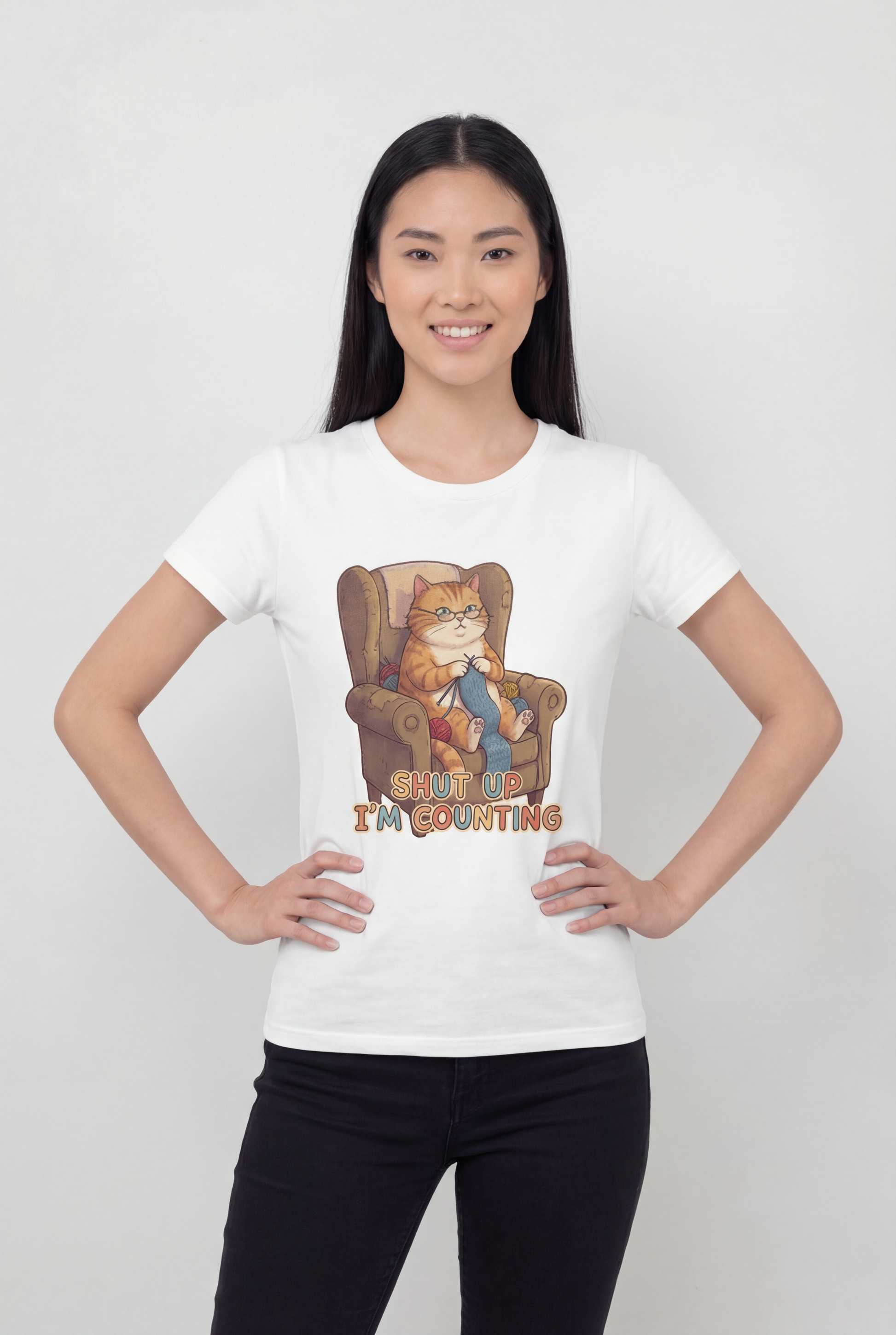 Meet your new favourite tee! This playful cat knitting t-shirt combines comfort with personality, featuring an adorable lazy cat and the hilarious "Shut Up I'm Counting" slogan.